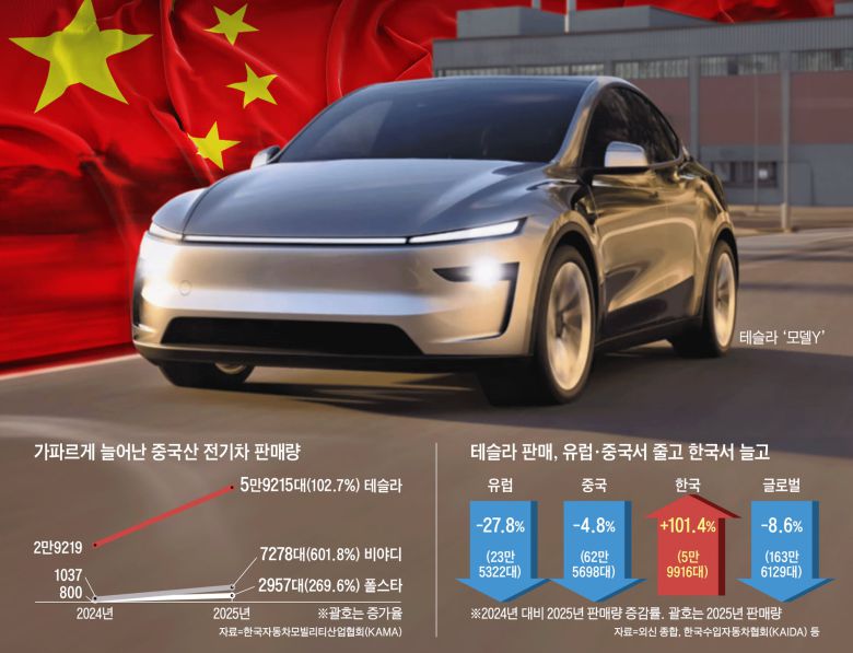 덕분에 테슬라는 지난해 한국 내 판매량 순위 5위에 올랐다. 국내에 생산 기지를 둔 KG모빌리티, 르노코리아, 한국GM마저 제친 것이다. 중국산 테슬라 바람에 자동차 업계에서는 “산업 생태계를 감안한 보조금 정책이 필요하다”는 목소리가 커지고 있다.