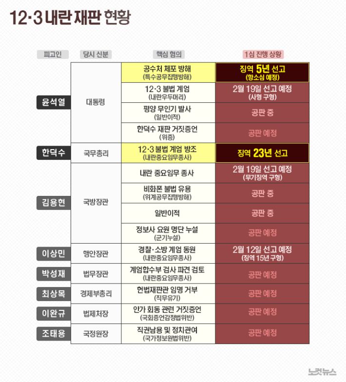 내달 12일 이상민 전 행정안전부 장관과 같은 달 19일 윤석열 전 대통령 등 내란 혐의 피고인들에 대해서도 유죄는 물론 중형이 선고될 가능성이 커졌다.