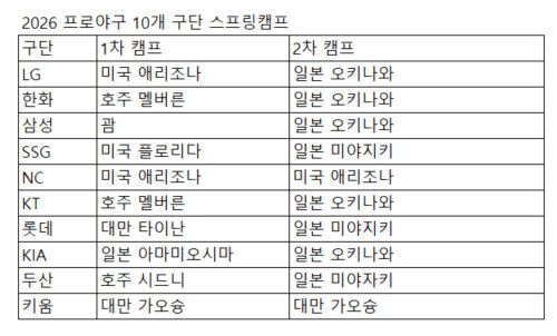 한여름인 호주에는 케이티를 비롯해 한화 이글스(멜버른·23일 출국), 두산 베어스(시드니·23일 출국)가 간다. 멜버른은 현재 낮 평균 25~30도 날씨를 보이는데, 가끔 40도 이상도 기록한다. 삼성 라이온즈는 미국령 괌에서 1차 캠프(23일 출국)를 한 뒤 오키나와로 건너간다.