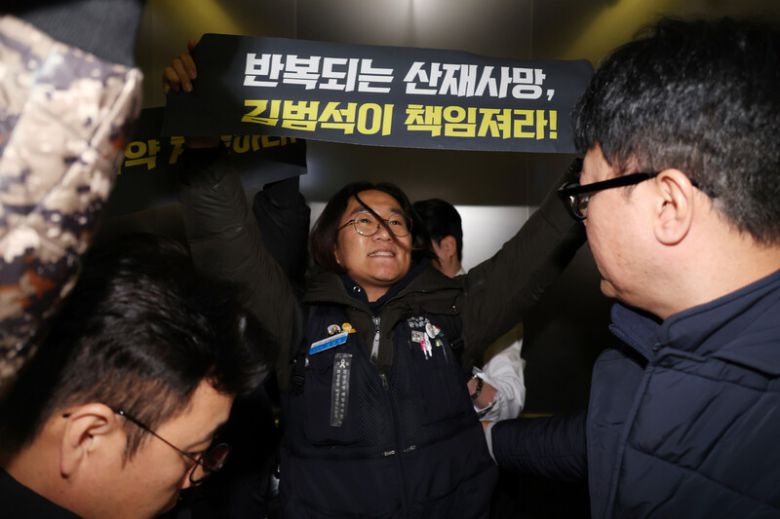 지난달 10일 오후 서울 송파구 쿠팡 본사가 있는 건물에서 민주노총 공공운수노조 쿠팡물류센터지회 조합원들이 박대준 쿠팡 대표이사를 만나기 위해 엘리베이터 탑승을 시도하고 있다. 김영원 기자 forever@hani.co.kr |