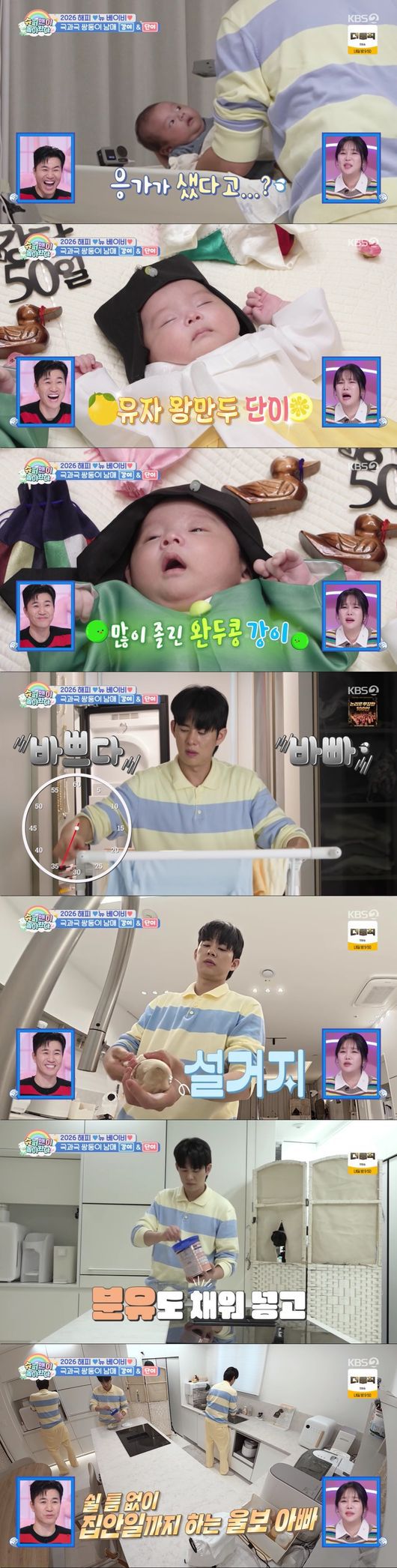 손민수가 쌍둥이 남매 강단이를 위해 50일 기념 한복 사진 촬영에 나서는 모습이 그려졌다. 아빠 혼자 쌍둥이의 옷을 갈아입히며 촬영까지 해야 하는 난도 높은 상황에 스튜디오에서 이를 지켜보던 랄랄은 "옷을 갈아입히는 게 쉽지 않을 것"이라며 우려를 드러냈다.