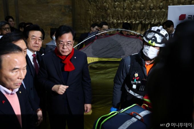 [서울=뉴시스] 김명년 기자 = 송언석 국민의힘 원내대표가 21일 국회 로텐더홀 장동혁 국민의힘 대표 통일교·공천헌금 '쌍특검' 수용 촉구 단식 농성장에서 소방 구급대원과 함께 대기하고 있다. 2026.01.21. kmn@newsis.com /사진=김명년 |