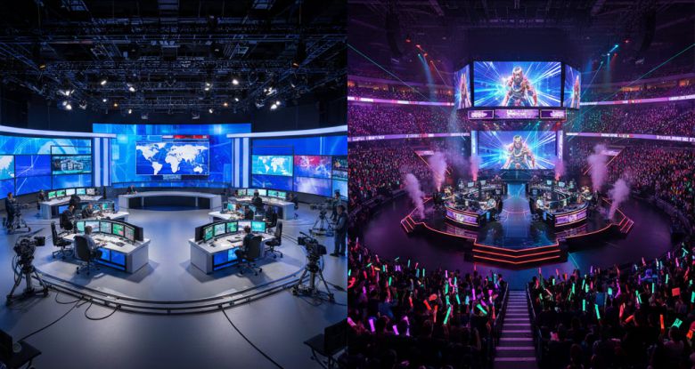 방송국 스튜디오 및 e스포츠 경기장 전경을 AI로 생성한 이미지 [CJ올리브네트웍스 제공] |