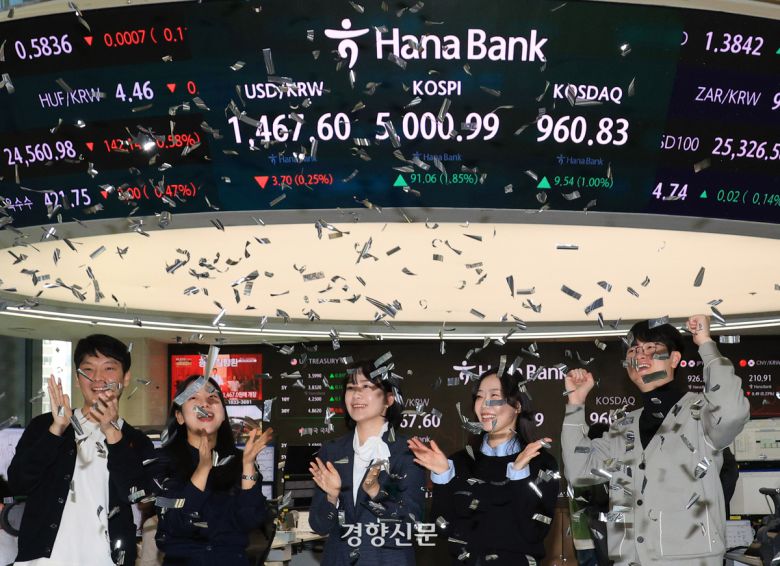 코스피가 장중에 사상 처음 5000선을 돌파한 22일 서울 중구 하나은행 본점 딜링룸에서 기념 세리머니가 열리고 있다. 2026.1.22. 이준헌 기자 |
