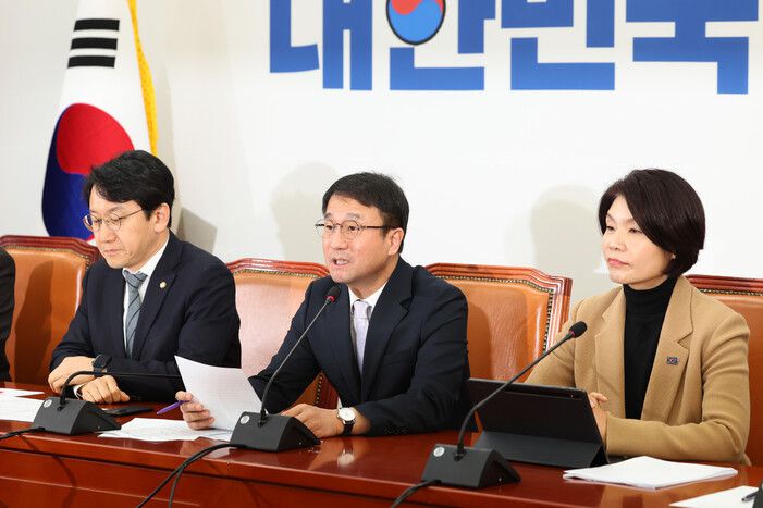 한병도 더불어민주당 원내대표(가운데)가 22일 오전 서울 여의도 국회에서 열린 정책조정회의에서 발언하고 있다. 김영원 기자 forever@hani.co.kr