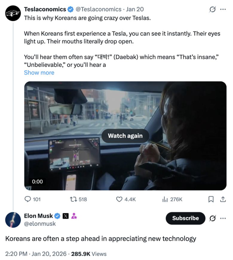테슬라이코노믹스는 한국인 유튜버가 테슬라 자율주행(FSD)에 탑승해 반응하는 영상과 함께 "이것이 바로 한국인들이 테슬라에 열광하는 이유다. 한국인들이 테슬라를 처음 접했을 때의 반응은 바로 알 수 있다"라고 설명했다.