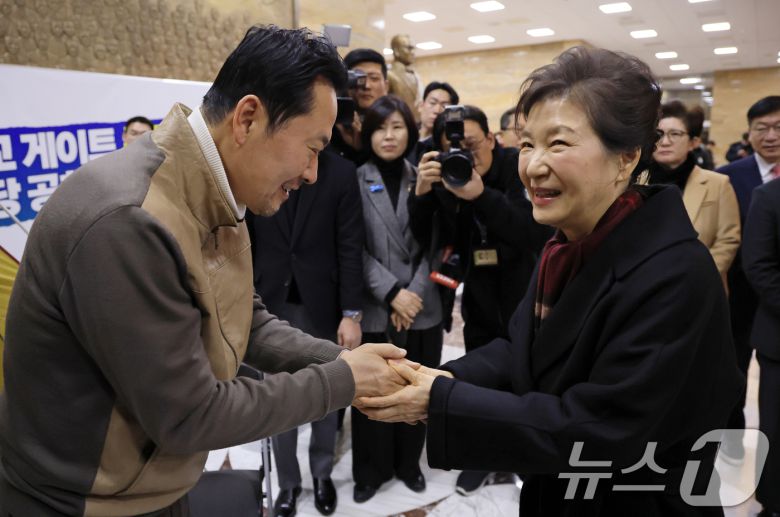 박근혜 전 대통령이 22일 서울 여의도 국회 로텐더홀에서 쌍특검(통일교·민주당 공천 뇌물 특검)을 요구하며 8일째 단식 중인 장동혁 국민의힘 대표와 인사하고 있다. (공동취재) 2026.1.22/뉴스1 ⓒ News1 신웅수 기자 |