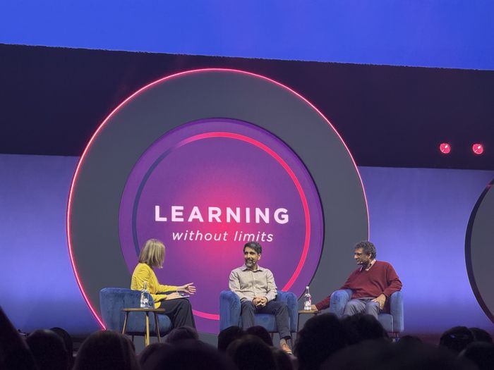 21일 개막한 'BETT UK 2026에서 구글 벤 고메스 책임자와 살 칸 CEO 겸 창립자가 두 기업의 AI 교육 협업에 대해 대담하고 있다. (사진=이지희 기자)
