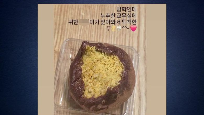 지금 보시는 화면은 작성자가 한 교사의 SNS 게시물이라며 공개한 건데요, 한입 베어 문 듯한 두쫀쿠 사진과 함께 "방학인데 누추한 교무실에 귀한 OO이가 찾아와서 투척한 두쫀쿠"라고 적혀 있죠.