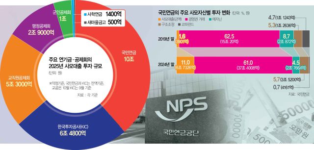 기관별로 보면 지난해 국민연금은 10조 원 이상, KIC는 6조 4800억 원, 교직원공제회 5조 3000억 원, 행정공제회는 2조 9000억 원을 사모대출에 배분했다. 국민연금의 사모투자자산 가운데 사모대출은 2019년 1.6%(3901억 원)에 불과했지만 2024년 말에는 11%(6조 7326억 원)로 급증했다. 2016년 국내에서 가장 먼저 사모대출 시장에 진입한 행정공제회는 메자닌과 사모대출을 통합해 운영했던 기존 크레딧투자팀을 둘로 나눠 한 팀에 북미·유럽 등의 사모대출을 전담시켰다. KIC는 2024년부터 사모대출을 별도 자산군으로 구분해 운용하고 있다.