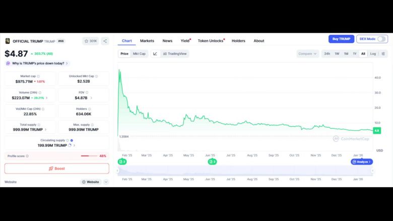 도널드 트럼프 미국 대통령의 밈코인 가격이 1년 전 고점 대비 90% 이상 폭락했다고 파이낸셜타임스가 보도했습니다.