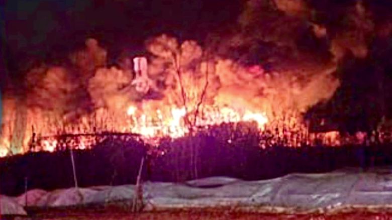 비닐하우스 사이로 시뻘건 불길이 치솟고, 소방대원들이 뼈대만 앙상하게 남은 비닐하우스를 살피고 있습니다.