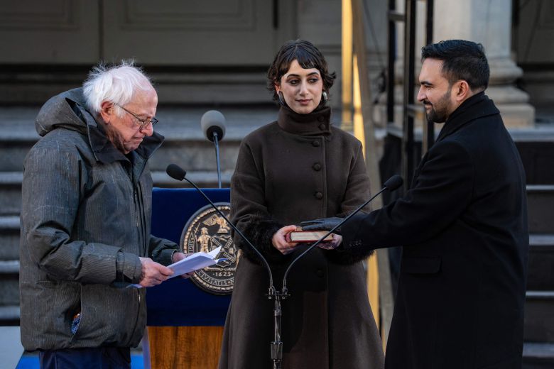 1일 미국 뉴욕시청에서 열린 조란 맘다니(오른쪽) 뉴욕시장 취임식. 미국 좌파 진영 거두 버니 샌더스 상원의원이 취임 선서를 주관했다./AFP 연합뉴스 |