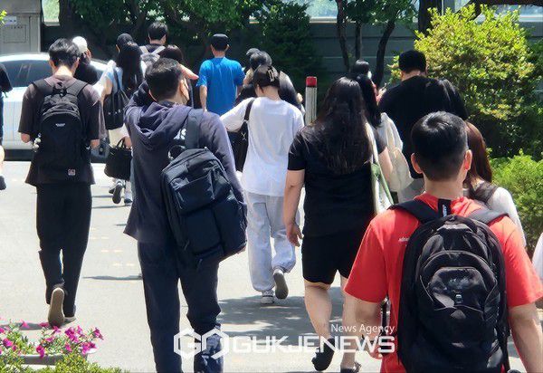 10일 대전 서구 갈마중학교에 마련된 시험장에서 응시생들이 공무원 시험을 마치고 걸어나오고 있다. 김영규 기자