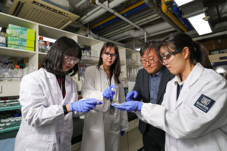 지난 20일 오전 서울대 자연과학대학의 한 실험실에서 서울대 연구팀과 화장품 ODM(제조자 개발 생산) 기업 코스맥스의 연구원들이 손상된 모발을 복구하는 액체를 테스트하고 있다. 왼쪽부터 코스맥스 박세린 연구원, 코스맥스 정수경 팀장, 서울대 화학부 이연 교수, 서울대 박사과정생 황혜민씨. /장련성 기자