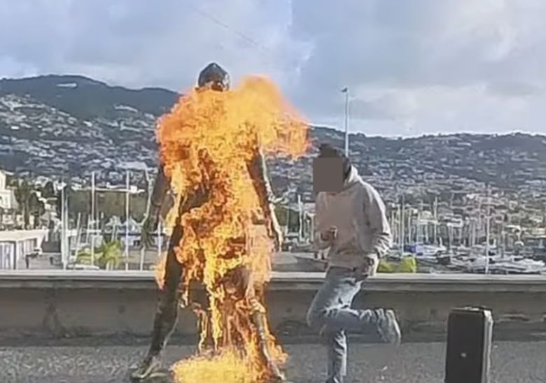 크리스티아누 호날두의 고향 포르투갈 마데이라에서 한 남성이 호날두 동상에 불을 지르고 있다./사진=데일리메일 캡처 |
