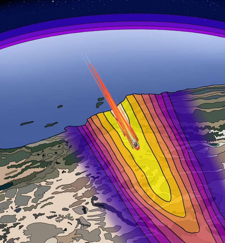지구 대기권에 진입하는 궤도 잔해가 미국 캘리포니아 상공에서 분해되며 음속 돌파음인 소닉붐이 발생하는 모습을 그린 그림. 소닉붐이 지면까지 전달되면서 지진계에 기록된다. 미국 존스홉킨스대 제공