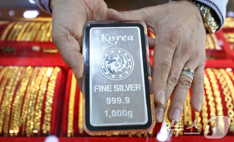 (서울=뉴스1) 최지환 기자 = 금·은 가격이 연일 고공행진하는 23일 서울 종로구 한 금은방에서 직원이 실버바를 정리하고 있다. 14시 24분 기준 현물기준 금 국 시세는 온스당 4천958.29달러, 은 시세는 98.67달러를 기록중이다. 2026.1.23/뉴스1