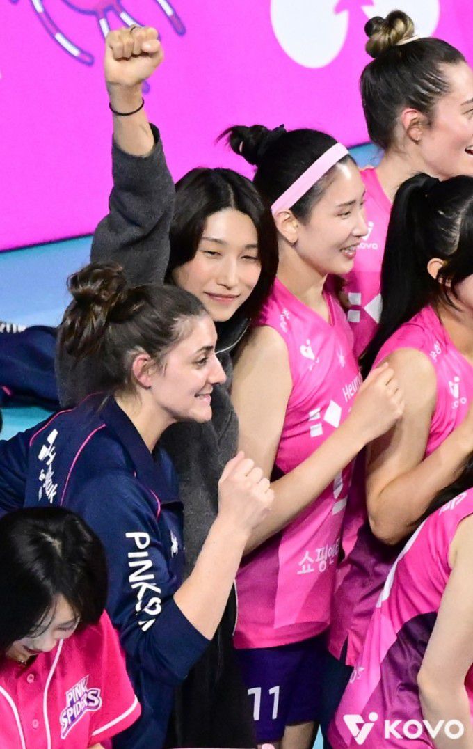 [서울=뉴스핌] 박상욱 기자 = 김연경의 응원에 힘을 얻은 흥국생명이 4라운드 마지막 경기에서 GS칼텍스를 꺾고 5연승을 달리며 2위로 올라섰다. 지난 시즌을 마치고 은퇴한 뒤 흥국생명 어드바이저로 활동 중인 '배구 여제' 김연경이 이날 경기장을 찾아 전 소속팀 후배들을 응원했다.
