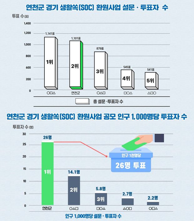 경기 연천군은 경기도가 추진한 ‘경기 생활쏙(SOC) 환원사업’ 오디션 공모 설문·투표에서 인구수 대비 투표율 1위를 기록했다고 23일 밝혔다. 군은 이번 투표율이 주민들의 생활 인프라 개선에 대한 열망이 반영된 결과라고 설명했다.