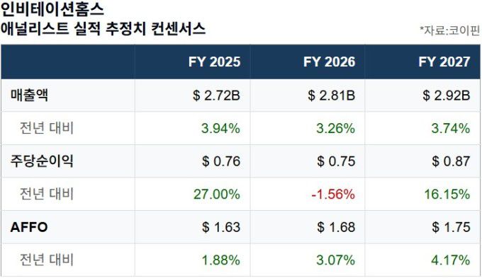 물론 트럼프 대통령 발언 전부터 인비테이션홈스는 실적 둔화 압박을 받고 있었다. 주가 하락이 그 연장선이라는 해석도 가능하지만 강세론자들의 평가는 다르다. 선벨트 지역(플로리다·텍사스·애리조나 등 미국 남부)의 신규 임대 공급 증가로 작년 매출과 이익 성장이 둔화한 것은 사실이다. 코이핀이 집계한 애널리스트 컨센서스에 따르면 AFFO는 작년 주당 약 1.63달러로 전년 대비 2% 증가가 채 안 될 것으로 전망된다.