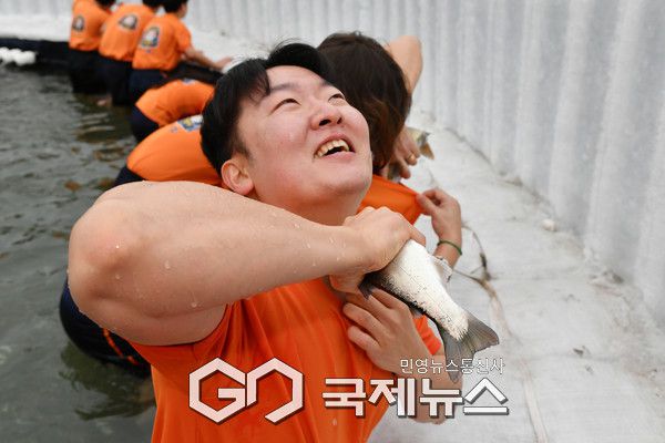 (화천=국제뉴스) 최옥현 기자 = 관광객들이 23일 화천산천어축제장을 찾아 맨손잡기 체험을 즐기고 있다.