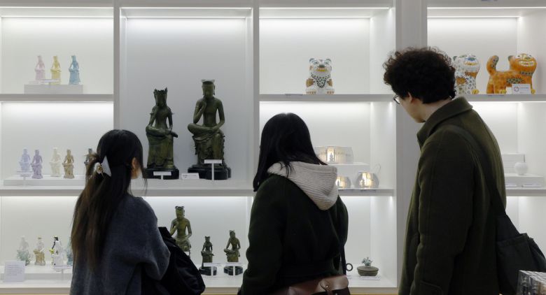 국립박물관 문화상품 매출이 역대 최고치를 기록한 23일 서울 용산구 국립중앙박물관 상설전시관 기념품점에서 관람객들이 문화상품 ‘뮷즈(MU:DS)’를 살펴보고 있다. 국립박물관문화재단은 이날 2025년 뮷즈 연간 매출액이 413억 3700만원으로 역대 최고치를 기록했다고 밝혔다.