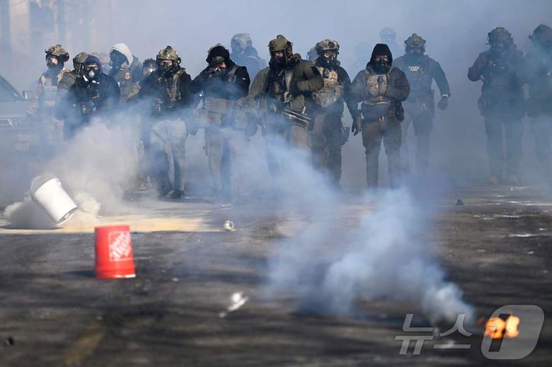 24일(현지시간) 미국 미네소타주 미니애폴리스에서 연방요원들과 시위대가 충돌하고 있다. 2026.01.24 ⓒ AFP=뉴스1 ⓒ News1 이지예 객원기자