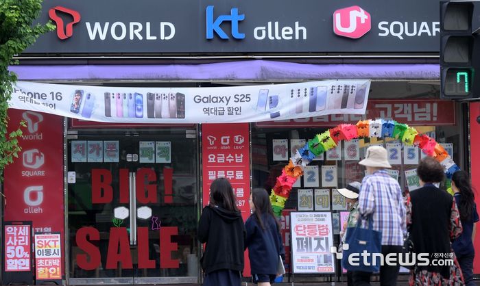 서울 시내의 한 단말기 유통점에 단통법 폐지 관련 마케팅 홍보물이 붙여져 있다. 김민수기자 mskim@etnews.com
