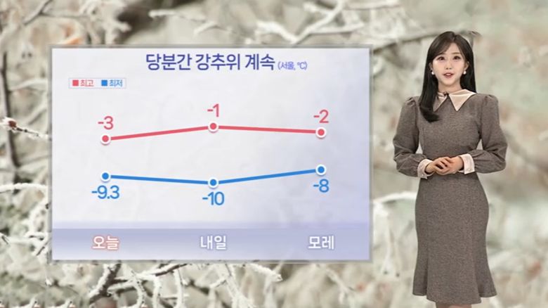 내일 아침 기온 보시면, 서울 영하 10도, 춘천 영하 14도로 출발하겠고, 한낮에도 중부지방은 영하권에 머물겠습니다.