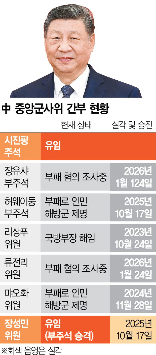 이로써 시 주석이 2022년 제20차 중국공산당 전국대표대회(당 대회)에서 3연임을 확정한 후 임명한 중국군 수뇌부 인사 6명 가운데 5명이 실각했다. 앞서 중국군 서열 5위였던 먀오화 당시 정치공작부 주임이 2024년 말 부패 혐의로 조사를 받으며 자리에서 내려갔다. 지난해에는 군 서열 3위였던 허웨이둥 전 부주석도 낙마했다. 여기에 군부 실세이던 장유샤와 류전리까지 실각하면서 7인의 중앙군사위원 중 남은 인원은 시 주석과 지난해 10월 부주석으로 승진한 장성민 등 2명뿐이다.
