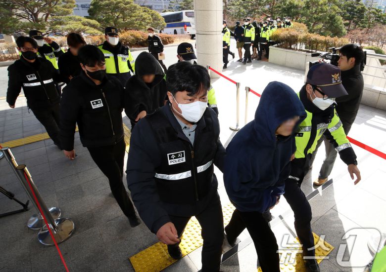 캄보디아에서 대규모 스캠 범죄를 저질러 강제 송환된 한국인 피의자들이 25일 오후 부산 연제구 부산지방법원에 구속 전 피의자 심문(영장실질심사)을 받기 위해 출석하고 있다.· 2026.1.25/뉴스1 ⓒ News1 윤일지 기자 |
