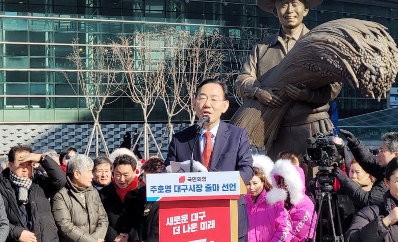 주호영 국회부의장이 25일 대구 동구 동대구역 광장 박정희 동상 앞에서 6·3 전국동시지방선거 대구시장 출마를 선언 하고 있다.[연통] |