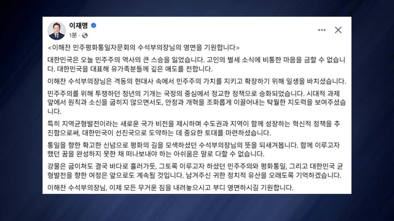 이재명 대통령은 이해찬 민주평화통일자문회의 수석부의장의 별세에, 민주주의 역사의 큰 스승을 잃었다고 추모했습니다.