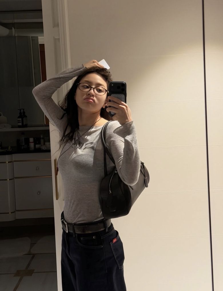 사진 속 지효는 안경을 착용한 채 거울 앞에서 셀카를 찍고 있다. 편안한 티셔츠와 청바지, 가죽 가방까지 더해진 차분한 스타일링은 무대 위 화려한 모습과는 상반된 매력을 전하고 있다.
