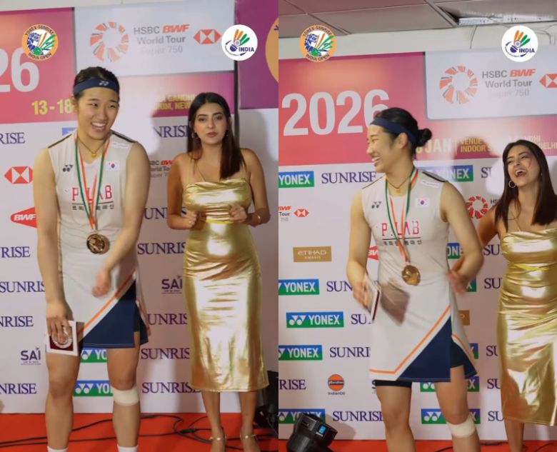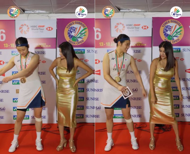 영상 속 안세영은 인도 오픈 시상식 무대 위에서 메달을 목에 건 채 밝은 표정으로 무대 중앙에 서있고, 인도의 진행자 아유시 셰카와트와 나란히 서서 춤을 추는 모습이 담겼다.