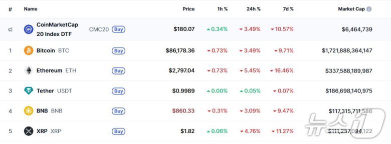 이 시각 현재 주요 암호화폐 시황 - 코인마켓캡 갈무리 |