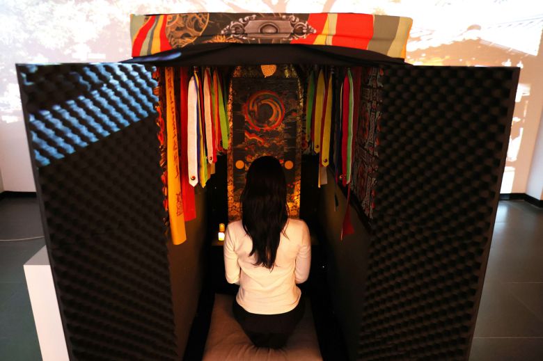 마치 점을 보러 무당집에 온 듯한 느낌이 들면서 나도 모르게 무릎을 꿇고 앉게 됐다. 중앙에 놓인 디지털 위패에 이름, 생년월일, 직업 등 개인정보를 입력하고 질문을 하면 AI 무당의 답변이 시작된다.