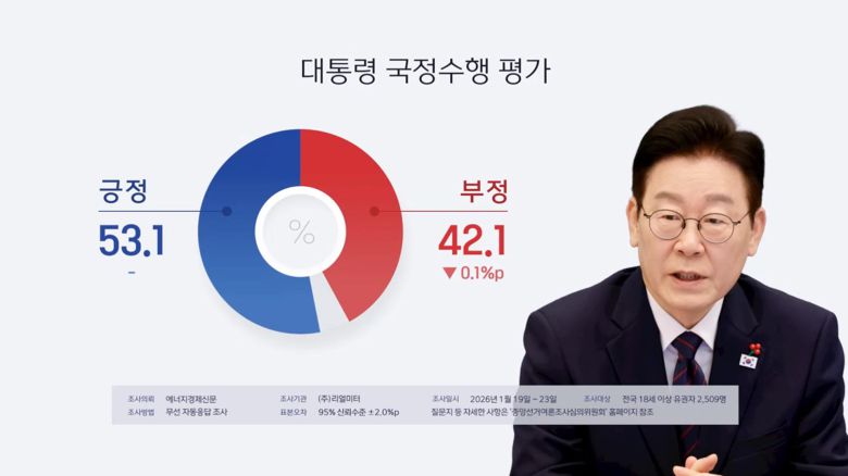 리얼미터는 "코스피 호재와 신년기자회견 효과로 주 중반까지 상승세를 유지했으나 이혜훈 후보자 인사청문회와 여권 내 합당 논란이 작용해 이를 상쇄했다"고 분석했습니다.