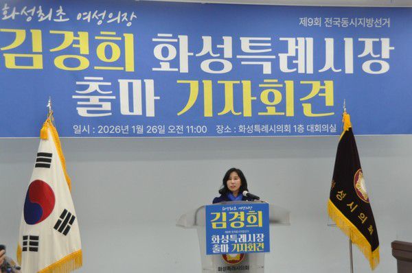 [최광묵] (화성=국제뉴스) 최원만 기자, 최광묵 기자 =2026년 1월 26일, 화성특례시의회에서 김경희 의원이 화성특례시장 출마를 공식 선언하며, 시민의 행복을 완성하는 행정을 약속했다. 그녀는 화성특례시의회 의장 및 의원으로서 8년간의 경험을 바탕으로, 시민의 목소리를 경청하고 이를 정책으로 반영하는 데 힘써왔다. 김경희는 화성시가 직면한 문제를 해결하기 위해 새로운 도전과 혁신이 필요하다고 강조했다.