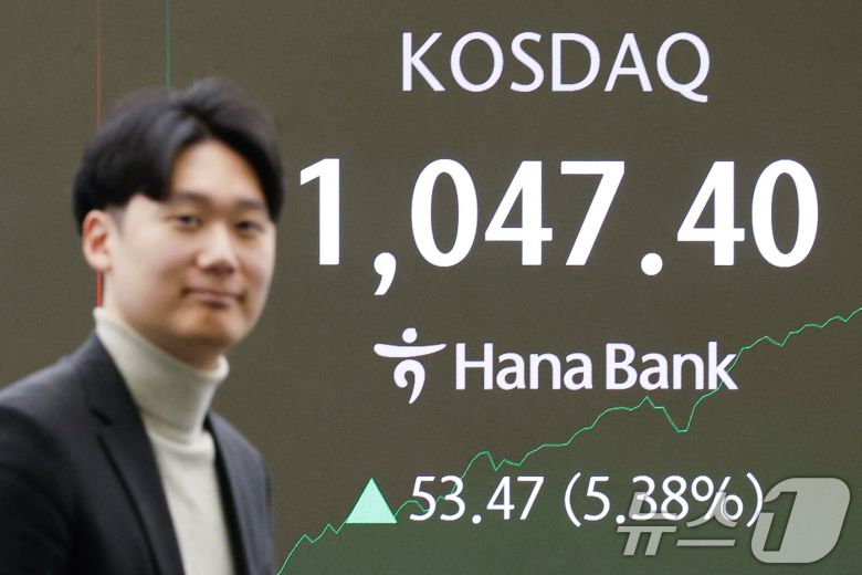 코스닥이 4년 만에 '천스닥'을 돌파한 가운데 매수 사이드카가 발동한 26일 오전 서울 중구 하나은행 딜링룸 전공판에 코스닥 지수가 나오고 있다. 2026.1.26/뉴스1 ⓒ News1 안은나 기자