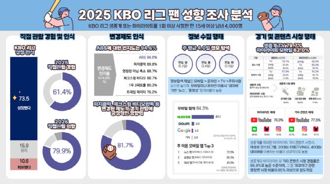 KBO는 26일 2025 KBO 리그에 대한 팬 인식과 소비 행태를 분석한 온라인 설문조사 결과를 발표했다. 조사는 KBO 리그 생중계 또는 하이라이트를 1회 이상 시청한 만 15세 이상 남녀 4000명을 대상으로 진행됐다.
