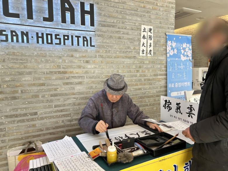 26일 울산엘리야병원 1층 로비에서 무료 가훈과 입춘축문 써주기 행사가 진행되고 있다. 울산엘리야병원 제공. |