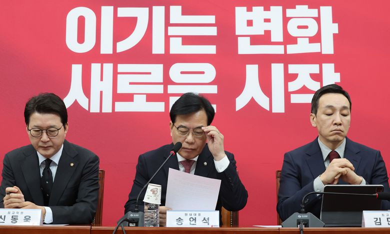 국민의힘 송언석 원내대표(가운데)가 26일 국회에서 열린 최고위원회의에서 발언 원고를 보고 있다. 이날 최고위에서는 지난 24일 있었던 한동훈 전 대표 지지자 집회를 두고 우려 목소리가 나온 것으로 전해졌다. 허정호 선임기자