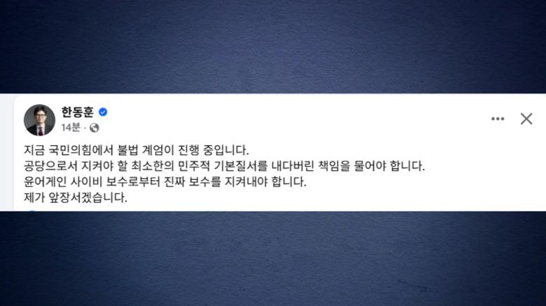 한동훈 전 국민의힘 대표는 친한계 김종혁 전 최고위원에 대한 윤리위의 '탈당 권고' 징계 결정 등 일련의 상황을 두고 국민의힘에서 불법 계엄이 진행 중이라고 비판했습니다.