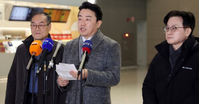 강훈식 대통령비서실장, 김정관 산업통상부 장관, 이용철 방위사업청장이 26일 오전 인천공항에서 잠수함 사업 등 방산협력 논의를 위해 캐나다로 출국에 앞서 인터뷰를 하고 있다. /인천국제공항=뉴스1