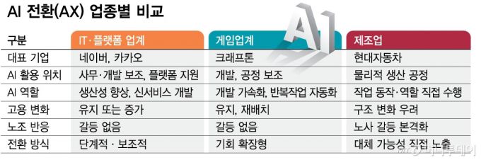 AX(인공지능 전환)를 맞이한 업계별 온도 차가 상당하다. AI(인공지능) 도입에 앞장선 네이버·카카오 등 IT(정보기술)업계와 게임업계에서는 AX를 고용충격 없이 진행 중이다. 반면 현대자동차에서는 휴머노이드로봇 '아틀라스' 도입을 둘러싼 노사갈등이 본격화됐다.