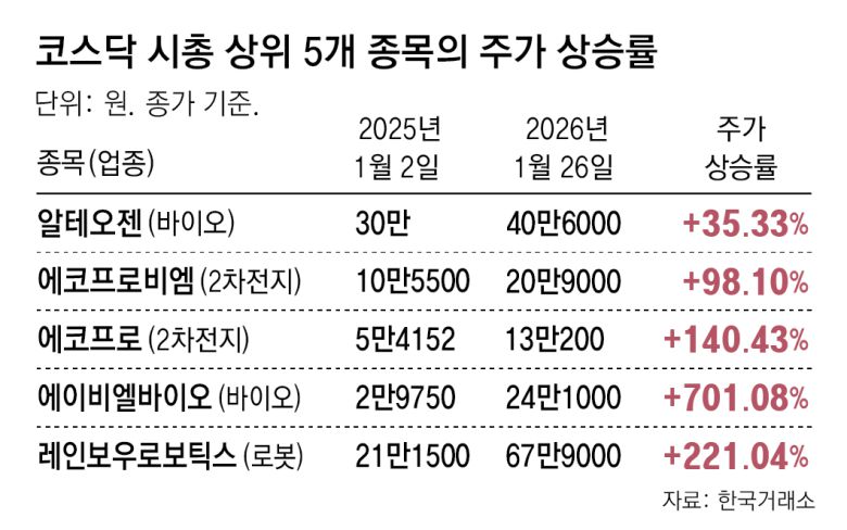 코스닥지수 1,000 돌파는 제약·바이오 업계, 2차전지 업계의 실적 개선이 결정적 영향을 미친 것으로 풀이된다. 코스닥 시가총액 1위 알테오젠은 지난해 1∼9월 영업이익이 873억 원으로 2024년 1∼9월(24억 원)에 비해 약 37배로 올랐다. 2차전지 핵심 소재 업체인 시총 2위 에코프로비엠은 2024년 1∼9월 영업이익이 306억 원 적자였지만 2025년 1∼9월에는 1078억 원으로 흑자 전환했다. 레인보우로보틱스(+25.97%), 에코프로(+24.17%) 등도 크게 올랐다.