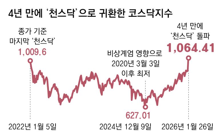 그동안 코스닥은 코스피에 비해 더딘 상승세를 보였지만, 최근 7개월간 40% 넘게 오른 끝에 이날 1,000 선을 뚫었다. 지난해 상반기(1∼6월) 600∼700 선을 오가다가 이재명 정부 출범 후 7월 800 선을 넘었다. 10월 27일에는 900 선을 돌파했고, 약 3개월 만에 다시 1,000을 넘은 것이다.