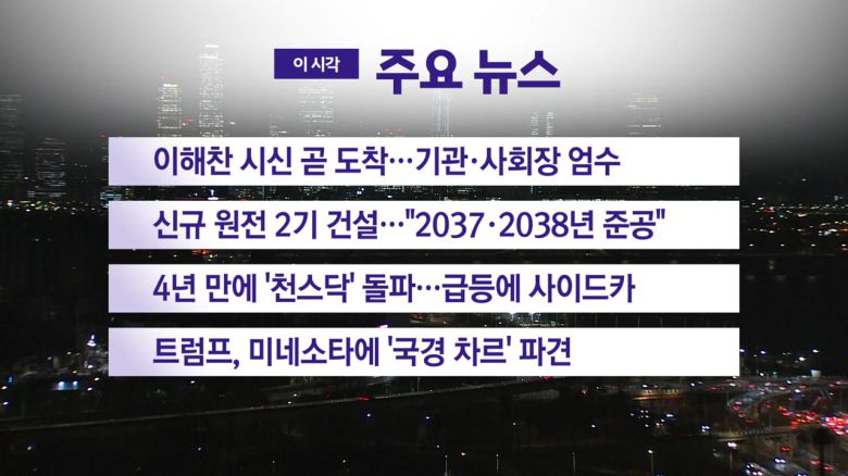 ■ 이해찬 시신 곧 도착…기관·사회장 엄수 ■ 신규 원전 2기 건설…"2037·2038년 준공" ■ 4년 만에 '천스닥' 돌파…급등에 사이드카 ■ 트럼프, 미네소타에 '국경 차르' 파견 [저작권자(c) YTN 무단전재, 재배포 및 AI 데이터 활용 금지] 대한민국 24시간 뉴스채널 [YTN LIVE] 보기 〉 [YTN 단독보도] 모아보기 〉이 기사의 카테고리는 언론사의 분류를 따릅니다.0공유하기